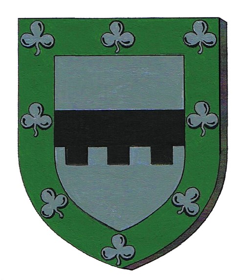 D'argent à la fasce de sable, bastillée de trois pièces, à la bordure de sinople chargée de huit trèfles d'argent. (Enregistrement n°72, Arr....