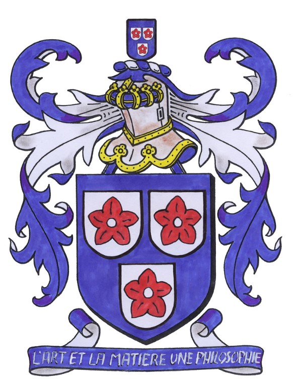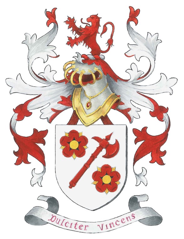 D'argent à la hache d'armes de gueules contournée et posée en barre, accompagnée de deux roses du même, boutonnées et barbées d'or. L'écu surmonté...