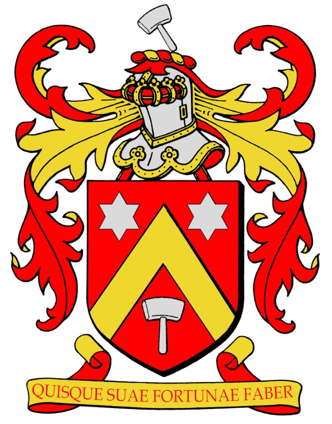 De gueules au chevron d'or accompagné en chef deux étoiles à six rais d'argent et en pointe d'un maillet du même. L'écu surmonté d'un heaume...