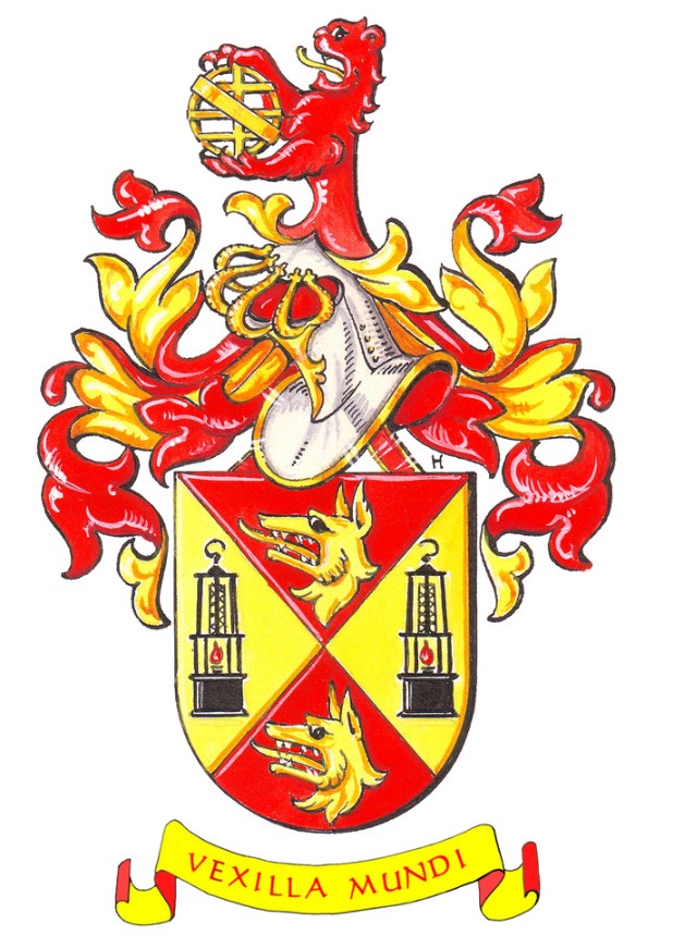 Ecartelé en sautoir : en 1 et 4, de gueules à la tête de loup d'or; en 2 et 3, d'or à la lampe de mineur de sable allumée de gueules. L'écu surmonté...