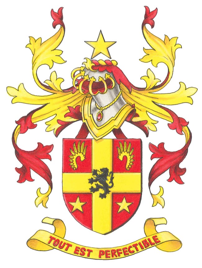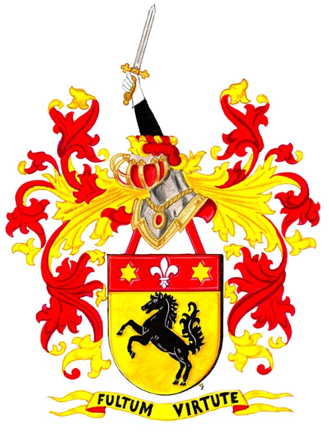 D'or au cheval cabré de sable; au chef de gueules chargé d'une fleur de lis d'argent entre deux étoiles à six rais du champ. L'écu surmonté d'un...