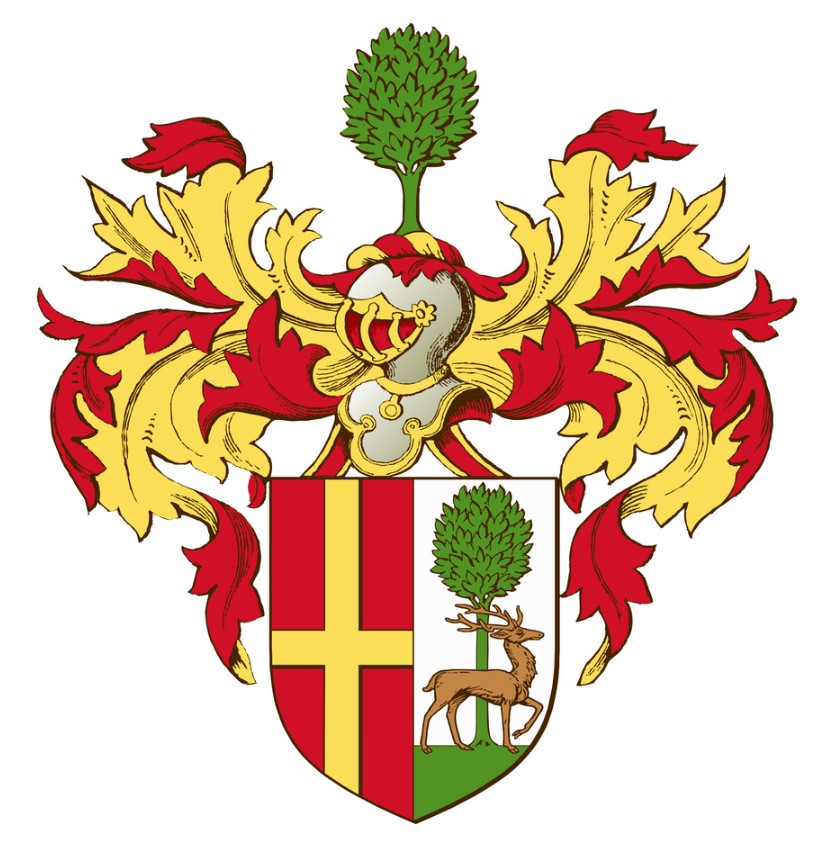 Parti : au 1 de gueules à une croix d'or; au 2 d'argent à un arbre terrassé de sinople accompagné devant le tronc d'un cerf passant contourné au...